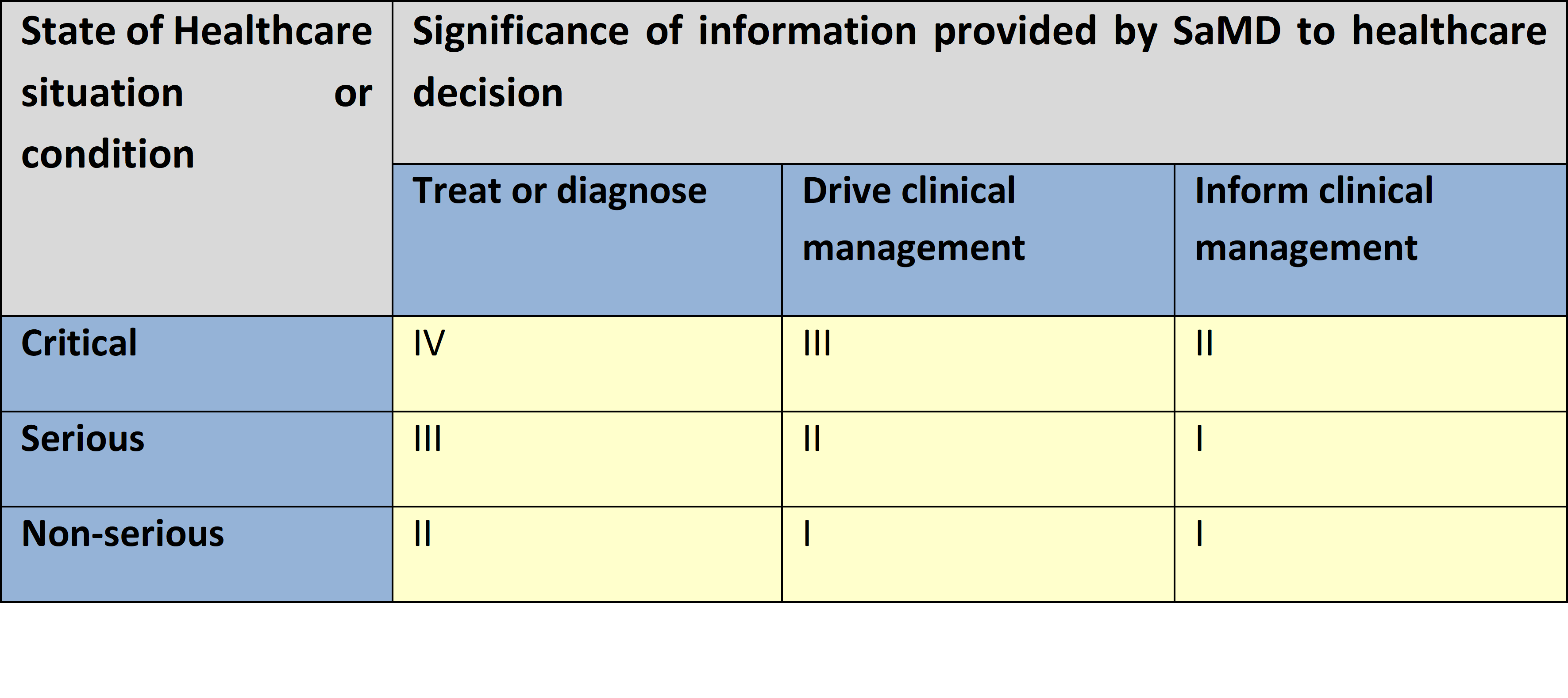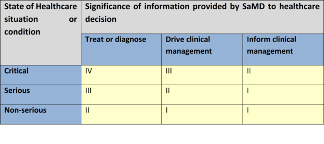 Based on the impact of the provided information on patient/public health, IMDRF establishes four SaMD risk categories: