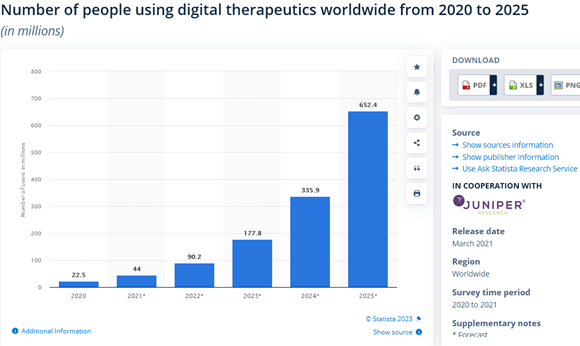 According to Statista, by 2025, over 652 million people are expected to use digital therapeutics: