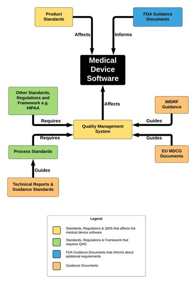 Given the prevalence of SaMD in the healthcare ecosystem, working on a common regulatory framework has become a pressing need, giving birth to the International Medical Device Regulators Forum (IMDRF). The guidance documents issued by IMDRF served as a base for the regulatory frameworks established by the E.U. and FDA. In her blog, Yan Chia offers a representation of the relationship between relevant standards, regulations, technical reports, and guidance documents: