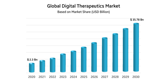 According to Strategic Market Research, by 2030, the global DTx market is expected to reach $35.78 billion, growing at a CAGR of 31.4%: