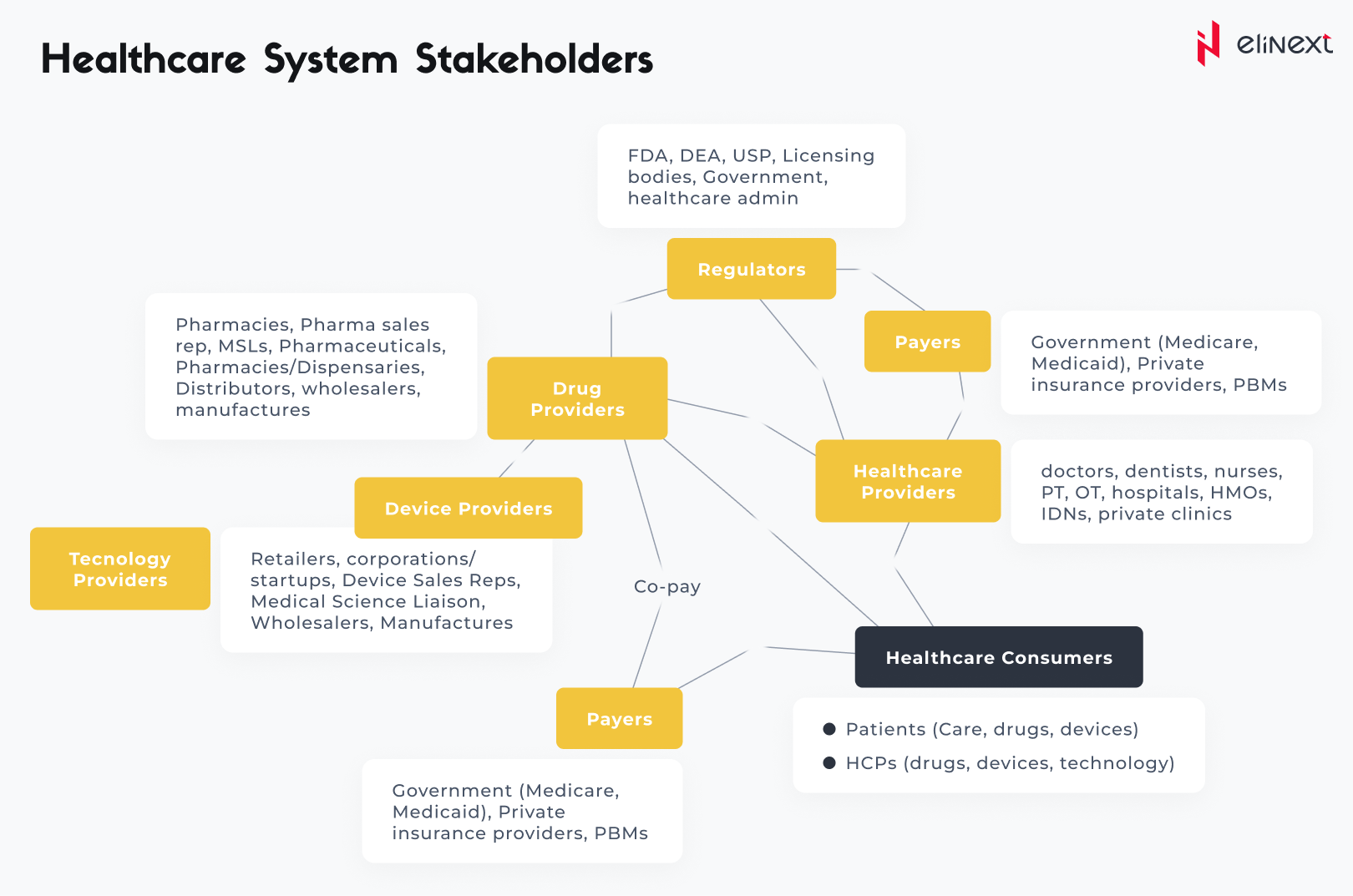 Healthcare as an industry is delivered through thousands of unique corporate entities, each of varying sizes, each involving interconnections. There are essential bidirectional relationships amongst various industry members. For Elinext, as for a HealthTech provider, it’s essential to understand these relationships deeply and the role of each party while developing a HealthTech product that is complied with all the standards and demands of the client and the end-user.