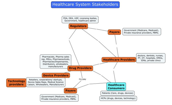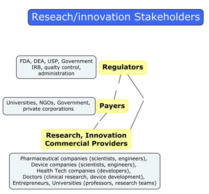 Healthcare as an industry has three main parties: Research and Innovation Providers, Payers, and Regulators. The major R&D providers are pharmaceutical companies, hardware and software HealthTech companies, clinics and hospitals, individual entrepreneurs and specialists, universities, and many others.