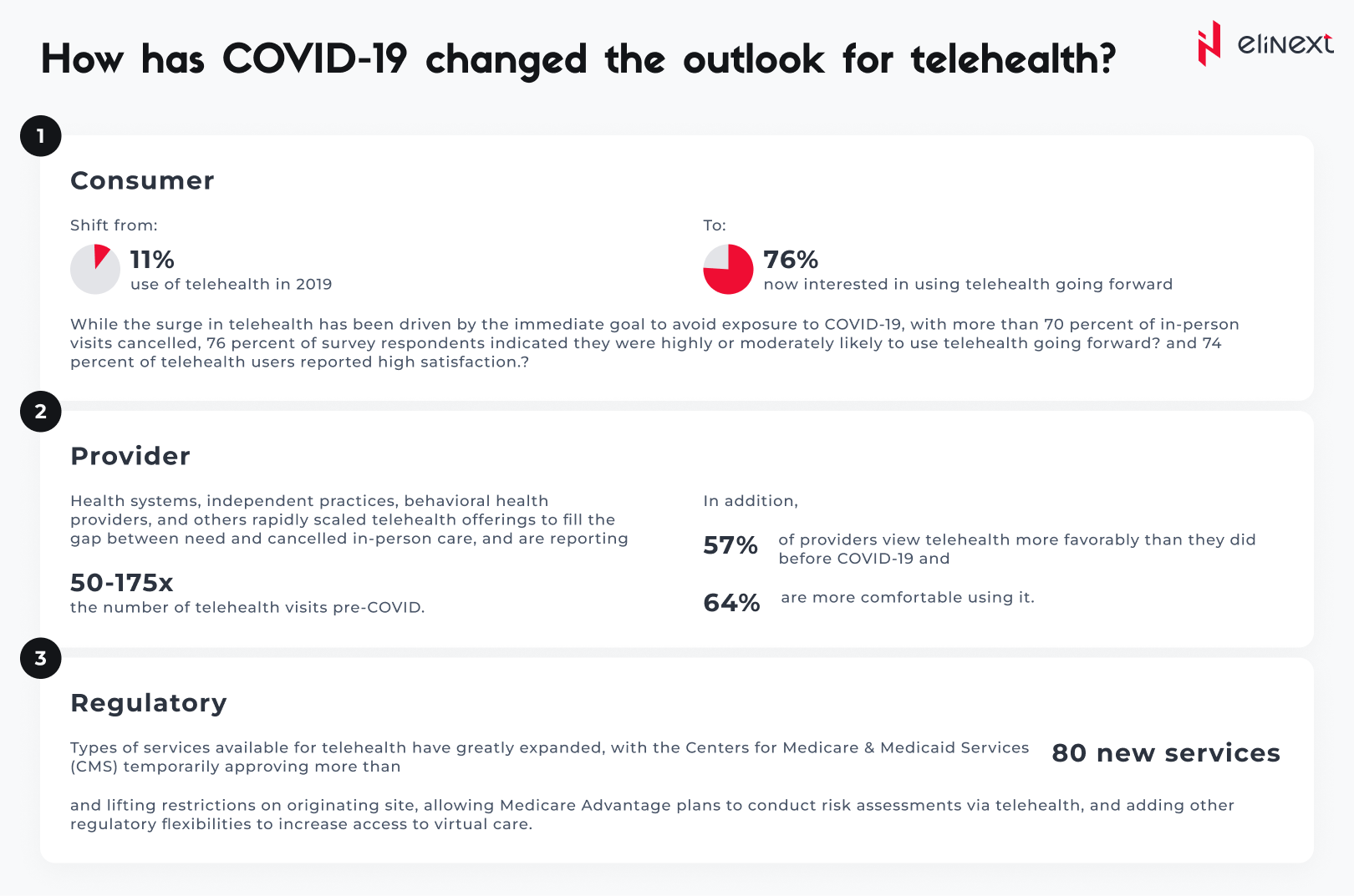 Develop scenarios on how virtual health will evolve and when, including how usage evolved post-COVID-19, based on expected consumer preferences, reimbursement, CMS, and other regulations.