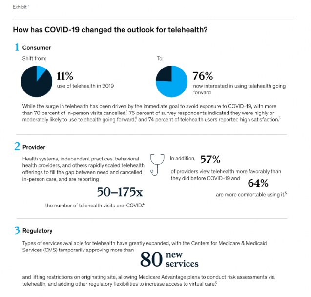 Develop scenarios on how virtual health will evolve and when, including how usage evolved post-COVID-19, based on expected consumer preferences, reimbursement, CMS, and other regulations.