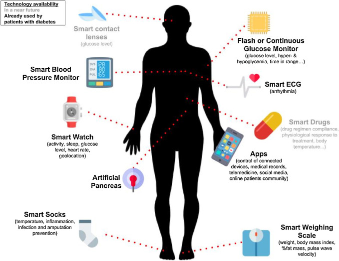 Today, people with diabetes can already use a range of connected devices that make their life a bit easier and a bit more relaxed. Such devices allow not just measuring physical activity, heart rate and temperature, but also continuously and effortlessly monitor their blood glucose level, body mass index, pulse wave velocity, sleep, activity, etc., as well as to detect inflammation and the risk of amputation. The variety of wearables is wide, and some of the most known forms existing today or coming in the nearest future are illustrated in the picture below.