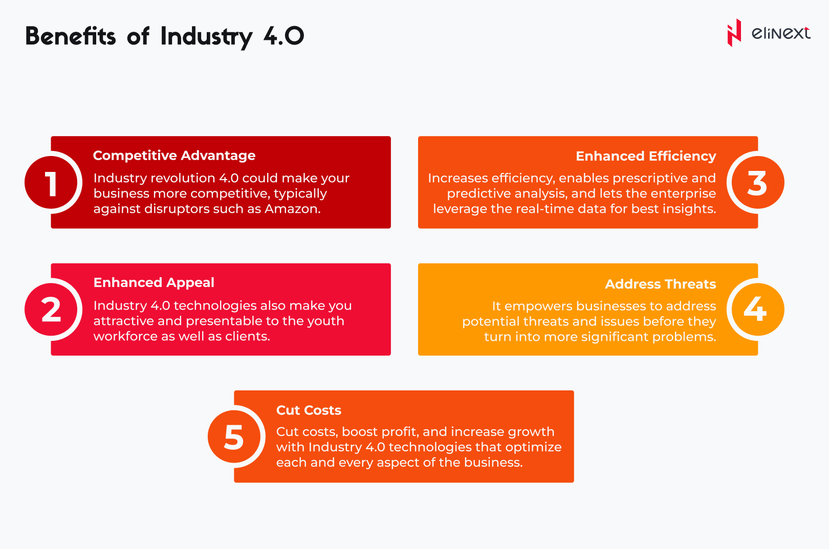 The benefits of Industry 4.0 include increased productivity, reduced downtime, and more informed decision-making, which drives innovation and cost savings.
