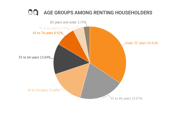 iPropertyManagement found out that 109 million US residents rent their houses. The following figure shows that almost 35% of renters are under 35 years old.