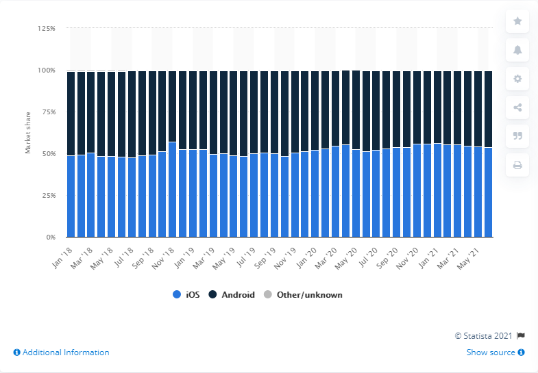 Provide both Android and iOS versions of your rental mobile app to meet the demands of users of both operating systems. The Eligraphics shows that iOS occupies 53.7% of the mobile OS market in North America, while Android accounts for 46%. If you want to cover a huge audience, develop two versions of your future rental app.