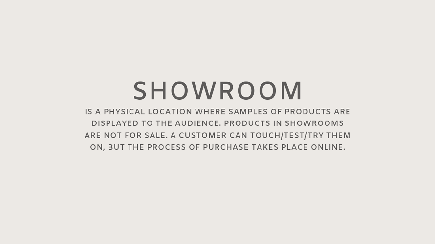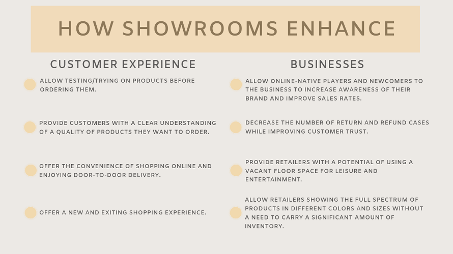 - Showrooms allow customers to inspect the merchandise before making an order, combining the best of both online and physical stores.