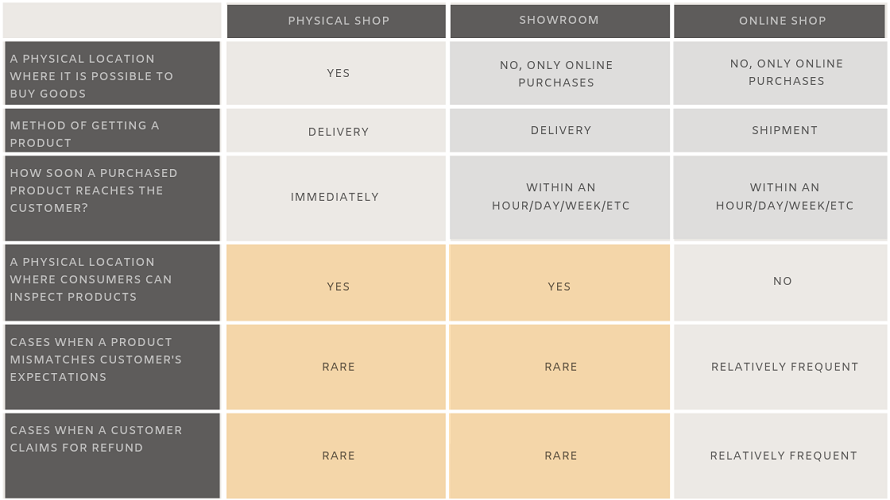 The table below points out features that make showrooms similar to completely traditional and online shops. Matches are highlighted with colours.